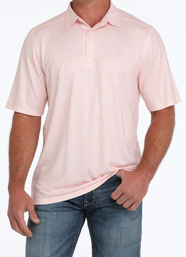 This pink printed polo by Cinch is perfect for spring. This polo features a light weight, moisture wicking poly spandex fabric, white buttons and a heat transfer logo.
