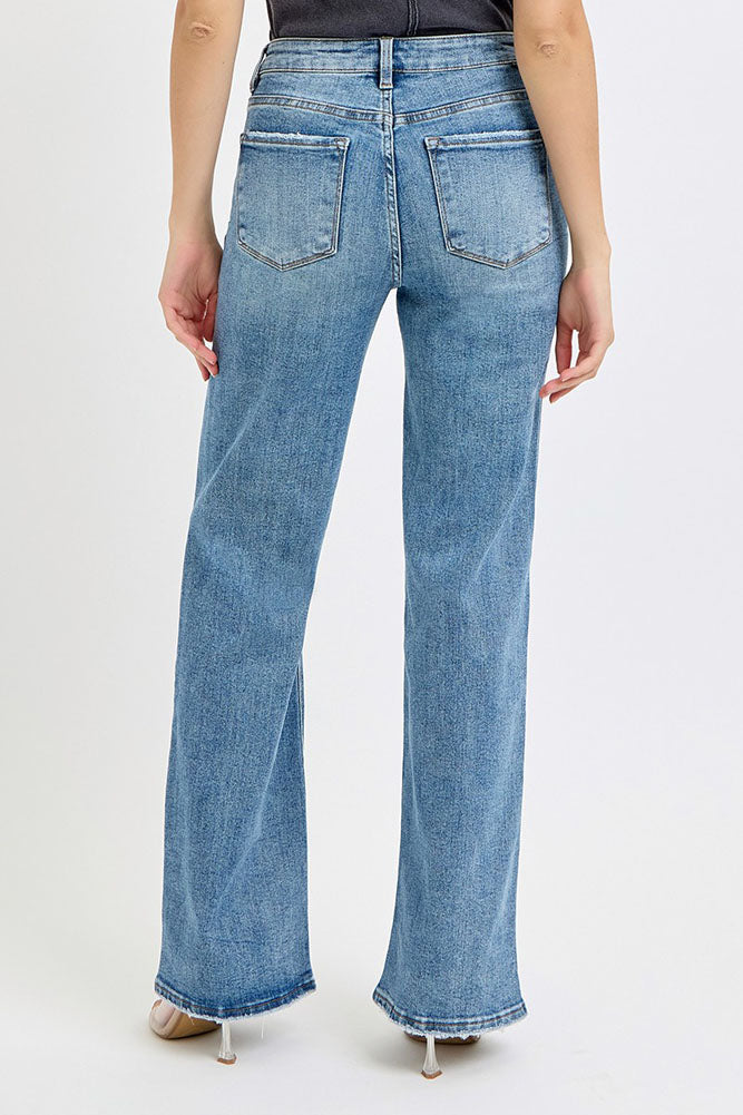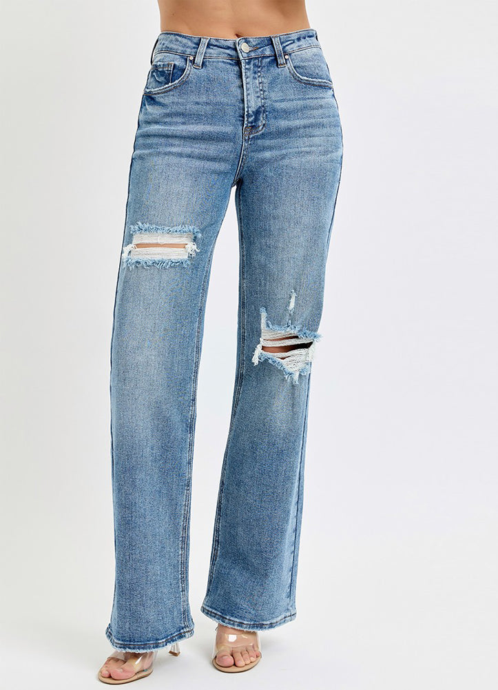 Trendy high-rise straight-leg jeans with distressed knees and a relaxed fit, combining effortless comfort and classic style for a laid-back modern look.