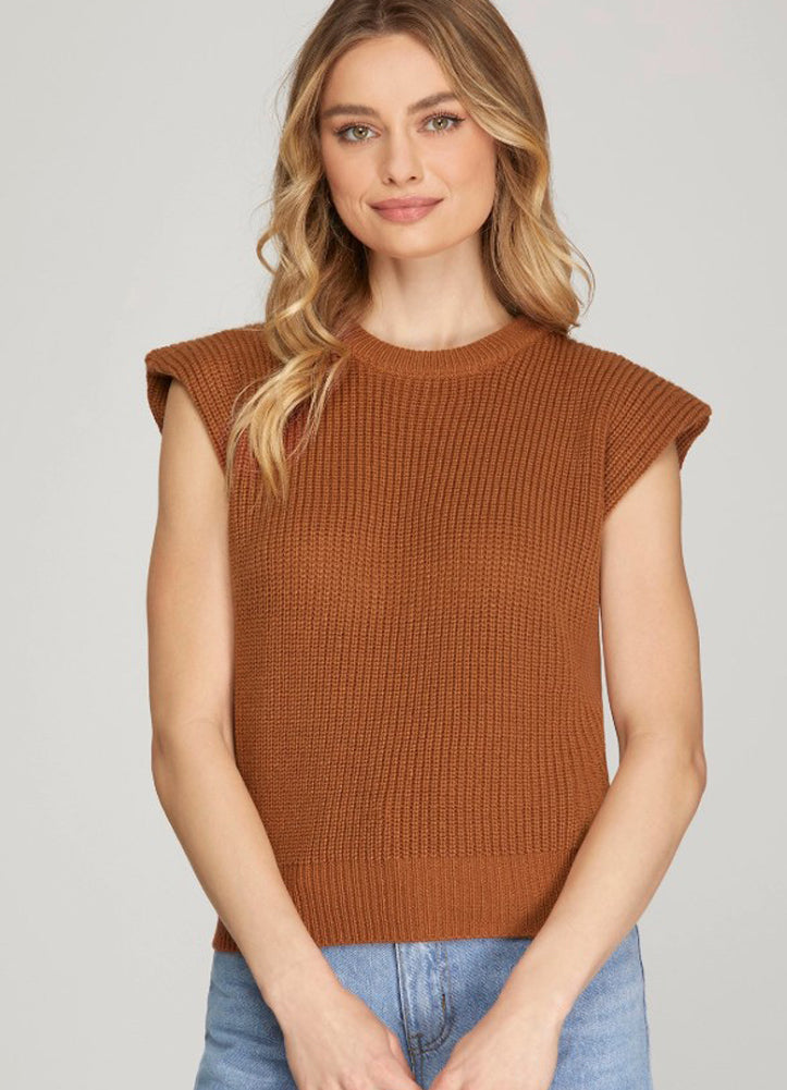 Minimal and modern, this camel knit sleeveless top features structured shoulders, ribbed texture, and a clean silhouette. Easy to style solo in warm weather or layered under jackets for year-round wear.
