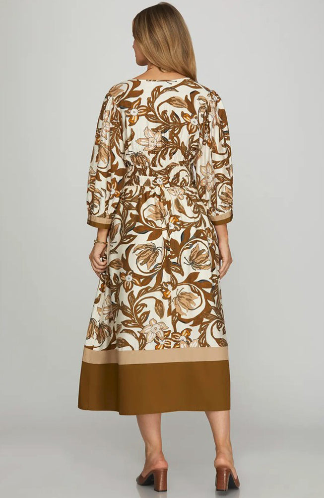 3/4 Sleeve Color Block Floral Midi Dress in Brown by She + Sky
