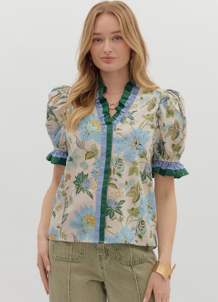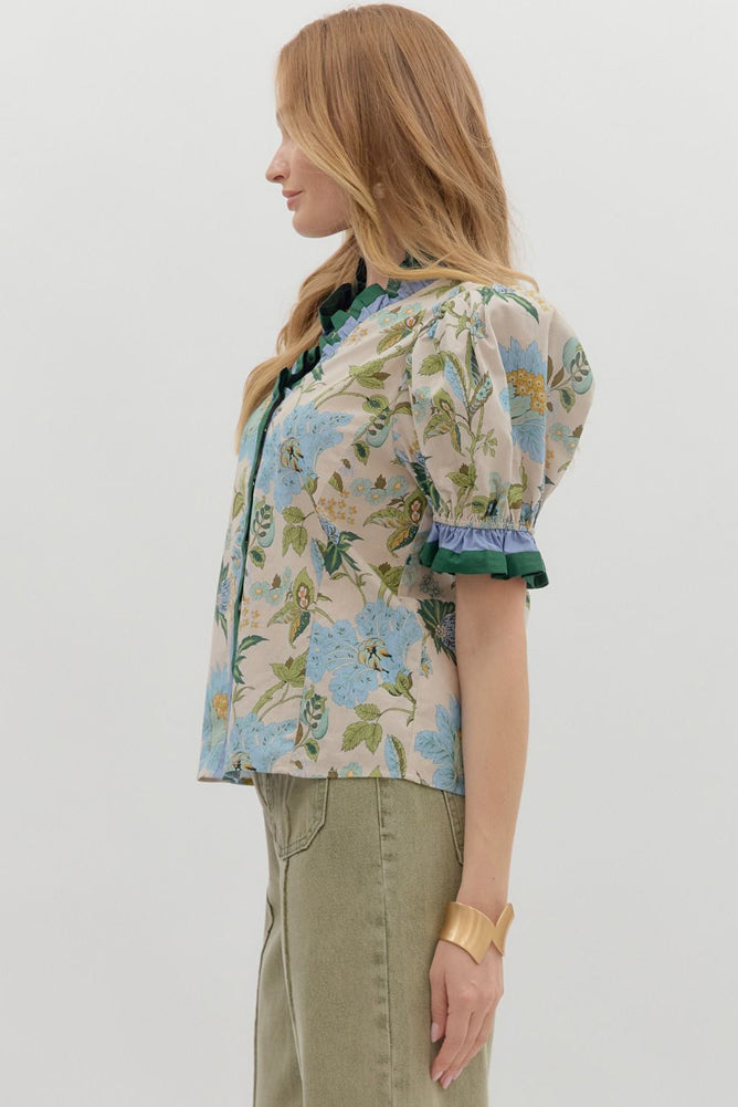 This puff sleeve blouse features a vintage-inspired floral print in soft blues and greens, paired with bold contrast ruffle trim for a playful pop. The structured silhouette adds elegance, while the breathable fabric keeps it light and easy. Dress it up with tailored pants or keep it casual with denim for a perfectly polished everyday look.
