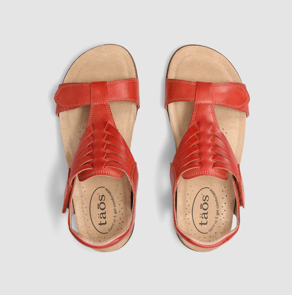 Bright and breezy, this red leather sandal features a woven T-strap design, cushioned contoured footbed, and adjustable hook-and-loop closure. Blending artisan style with all-day comfort for warm-weather wear.